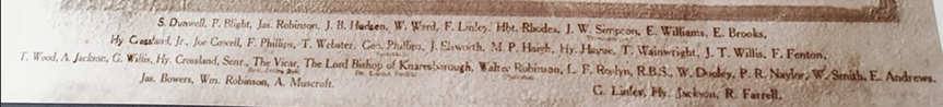 T. Wood, A. Jackson, G. Willis, Hy. Crossland, Senr., The Vicar, The Lord Bishop of Knaresborough, Walter Robinson, I. F. Roslyn, R.B.S., W. Dooley, P.R. Naylor, W. Smith, E. Andrews,