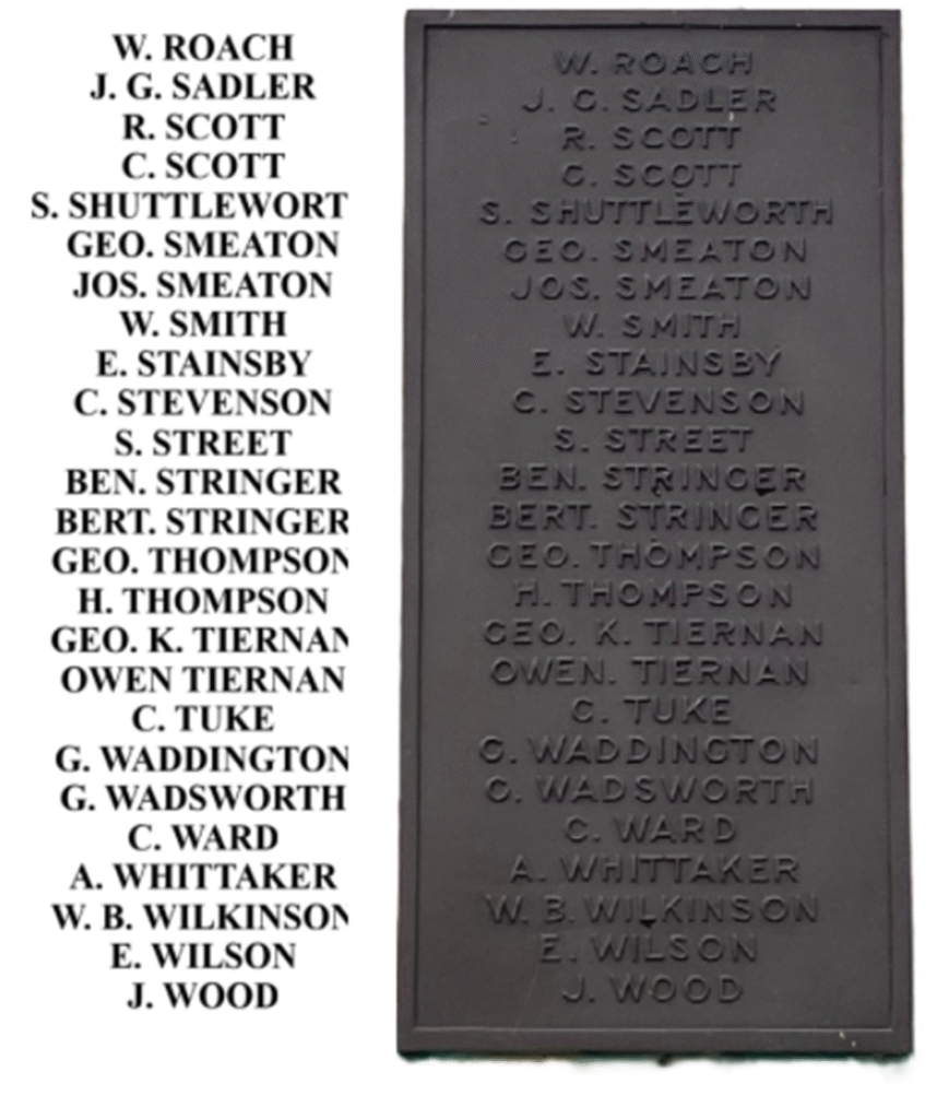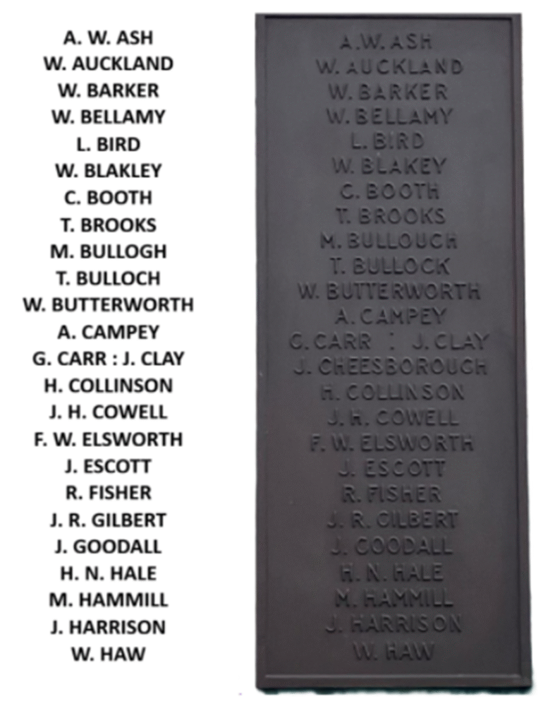 | C. O. ADAMS J. R. ADDINALL C. W. ARMITAGE J. BALDWIN A. BICKERDIKE D. BEEVER F. BIRDSALL B. BOLSTRIDE E. BULLOCK H. BRUNYEE A. CARTER M. COLLEY J. COLLINS H. COOPE E. COWELL E.DICKINSON J. DOUGLASS J. W. EMPSON E. EVANS GEO. FIELD G. B. FIELD A. FIRTH W. H. FLETCHER J. FOX | W. CARLICK G. W. GELDER G. H. GODDARD GEO. GOODALL W. GOODALL J. A. GORDON A. GREEN J. G. HAIGH S. HANDLEY T. W. HOLLIDAY A. JACKSON J. KENDREW W. LAZENBY A. LEWIN W. LLOYD W. M. LYNN E. MACNALLY GEO. MAY W. MIRFIN J. A. MOSBY JOB. NASH T. NELSON A. NICHOLLS J. NORMAN | J. W. NORTON W. PAINE G. PALMER H. PINFOLD J. ROBINSON R. ROLLINS G. H. RUSHWORTH SAM. T. SCHOFIELD T. SCHOFIELD W. H. SCOTT NORMAN C. SMITH T. A. L. SMITH THOS. SMITH WALTER STEELE WILLIAM STEELE J. W. STOCKWELL H. THORNHILL H. VARLEY J. VICKERS J. H. VODDEN E. WEBSTER R. WESTMORELAND H. WILSON A. W. WRIGHT |
