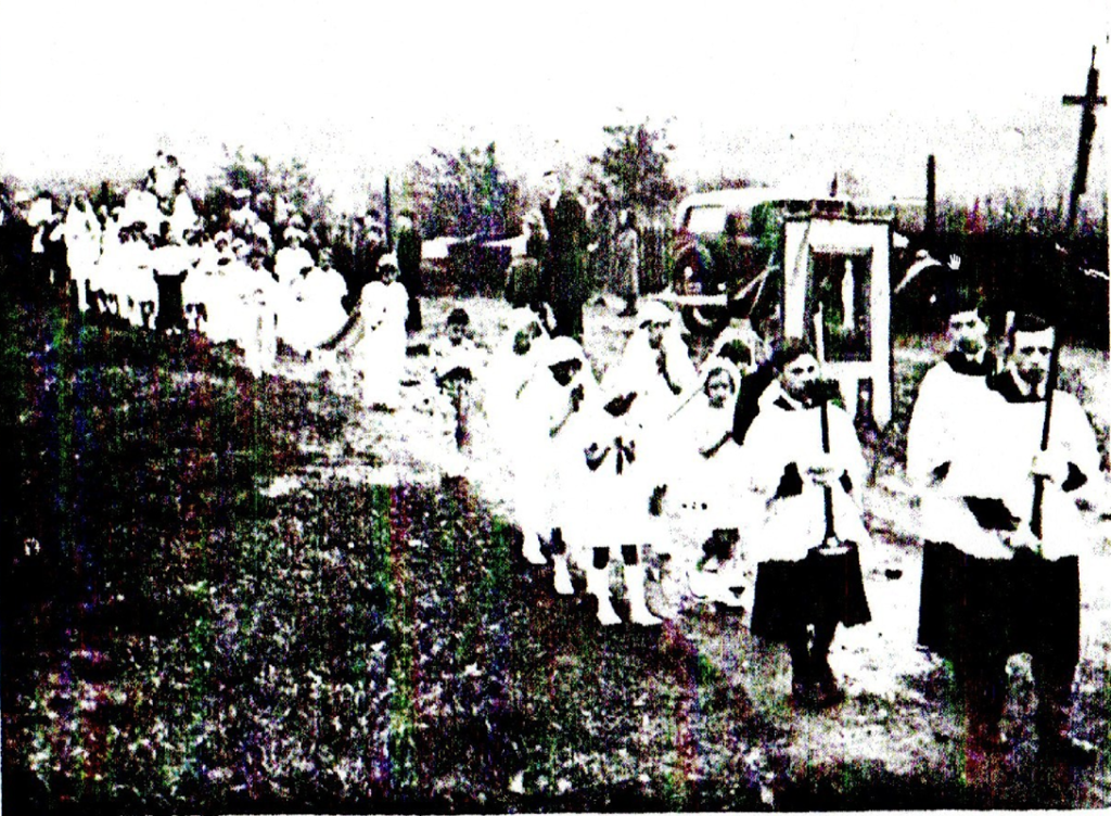 Then, in 1936, Canon Hewison died. He was succeeded by Fr. Comerford, who, after a while, began to have Sunday Mass said at Swillington as well as at St. John’s, the priest travelling from Castleford to each place. For two years Mass was said at the Swillington Hotel, through the kindness of Mr & Mrs Bickerstaff, and then in the Miners’ Welfare, throughout the period of the 39 – 45 War and up to 1954, on a trestle table raised on wooden blocks brought from Primrose Pit. (The assistant priests included Frs. Farrelly, Creed, Belton, Roche and Townend). By this time, apart from all the world-wide movements of population, a smaller one took place, closer to home the Victoria and Albert Pits closed in 1948 and Bowers Row began to be demolished in 1951. Coalmining had been a nationalised industry since 1947. Kippax Park was demolished in 1953, but house- building was re-started in all the villages of the area.