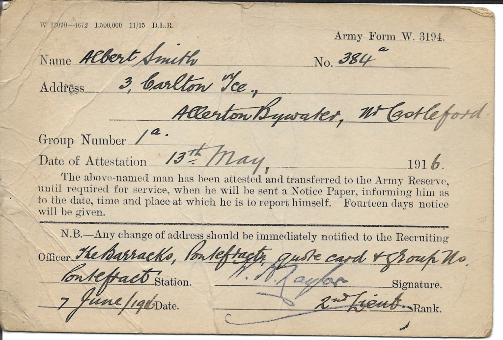 During the 1st World War Edward enlisted on the 12thFebruary 1915 at Pontefract, Height 5ft 7 3/4 inches, Chest 34 ½ inches, Brown Hair and Grey eyes. Form signed by his Stepfather James Taylor.