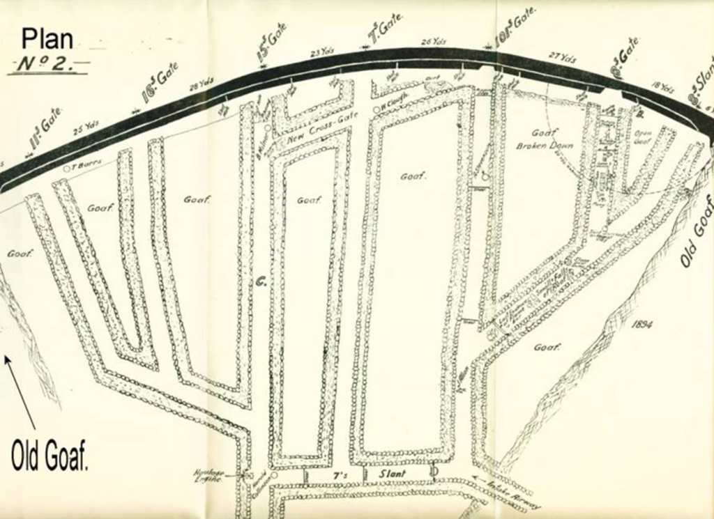 Despite its name, the district was only started in April, 1929, to work out an area of coal between two wastes. Reference to the key plan on Plan No. 1 shows that the face was gradually extending as it advanced and had attained a length of 147 yards. There were six working places known from left to right as 11’s, 16’s, 15’s, 7’s. 101’s and 8’s, the numbers being those under which the collieries occupying the places were entered in the pay books. No. 8’s men had a slant gate and a new end-gate.