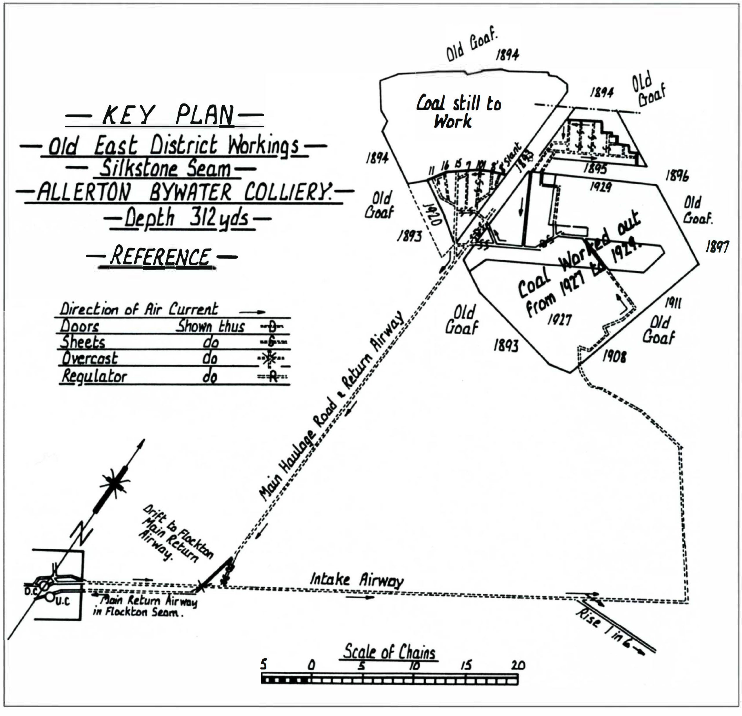 The Silkstone Seam was cut by the shafts at a depth of 312 yards and a rising haulage road approximately three quarters of a mile long led to the Old East District in which the accident occurred.