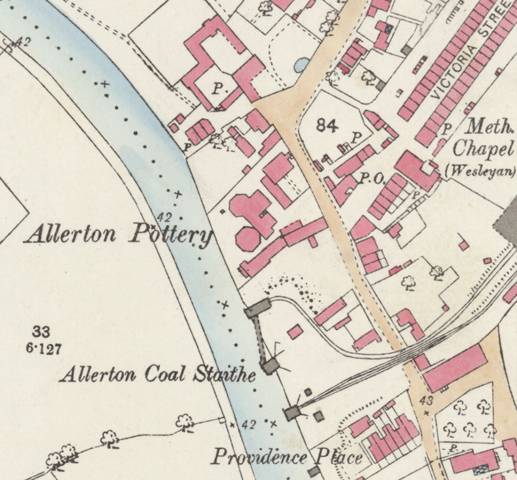 Allerton-Bywater pottery was located near the bottom of main street in Allerton Bywater, on the riverside, opposite what is now the Vitoria Inn.
