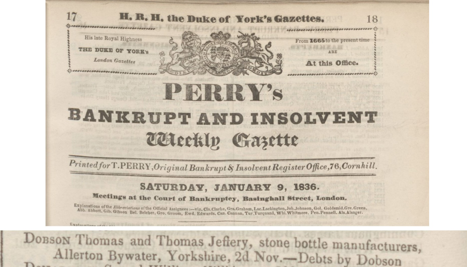January 9th 1836 – Thomas Dobson & Thomas Jeffrey shown as bankrupt and insolvent in Perry’s weekly gazette. Shows as debts by Dobson.Partnership dissolved.