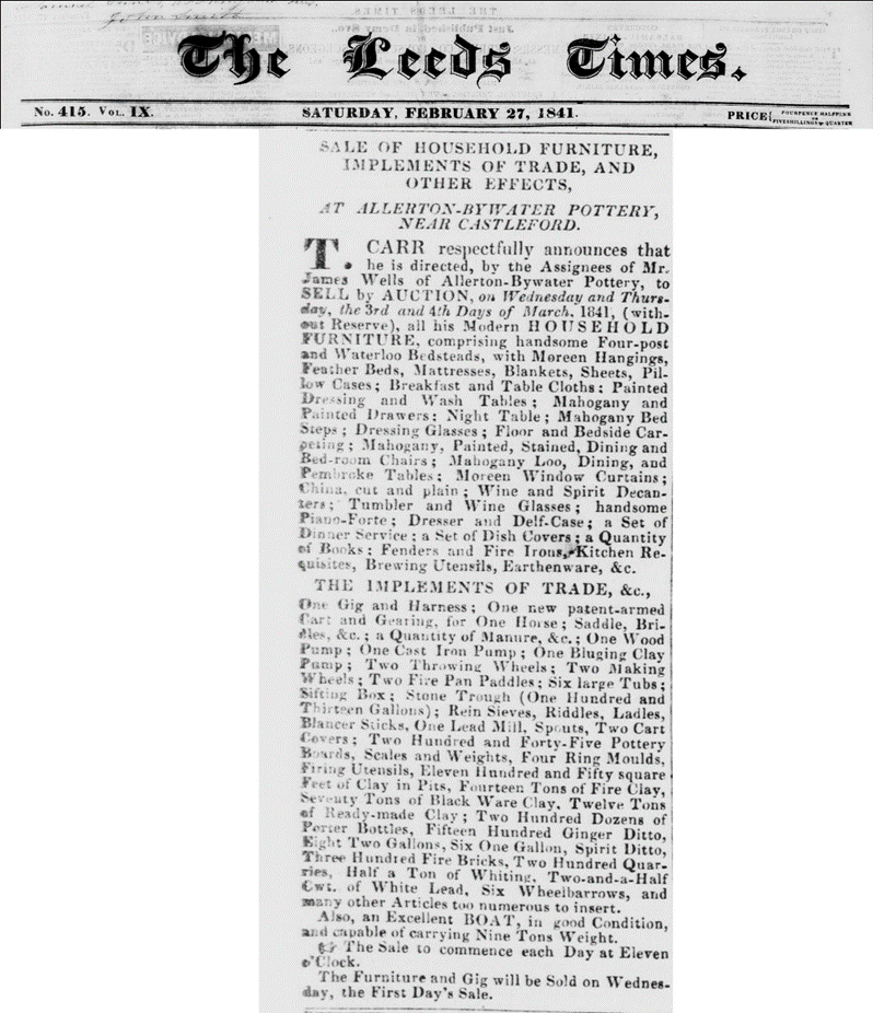 February 27 1841 Sale by auction of the assignees of Mr James Wells of all household furniture and implements of trade.