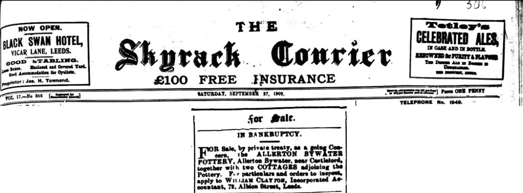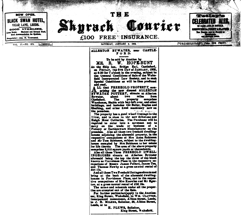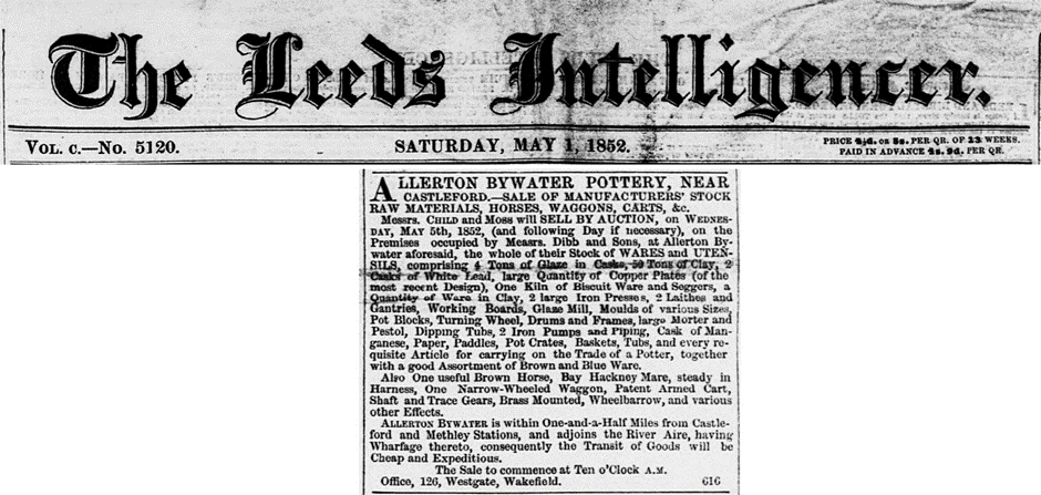 February 16 1839 Leeds Intelligencer shows pottery to be sold by auction. Property in the possession of Mr Thomas Dobson. The adjacent land in the possession of Mr Samuel Sowden. The buildings recently erected.