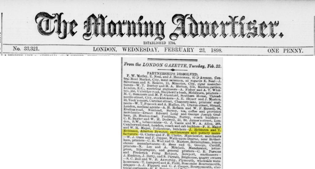23 February 1898 Partnership dissolved between J Robinson & T Robinson.
