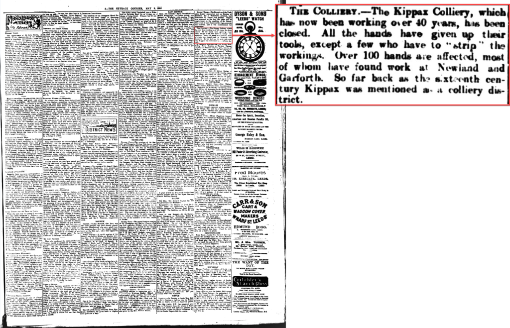 Kippax colliery closes in 1903 after more than 40 years of operation.