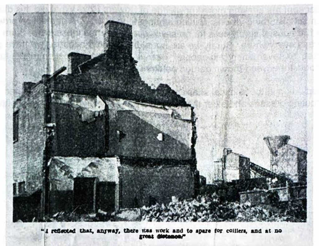 I countered with a last plea that the haunting would might cease: “Surely one cannot imagine that the breaking down of the isolation of the miner is other than good”. Came the answer” Heaven forbid. But its the speed ….. the finality. In the years to come there will be no romantic excavations of the dead village of Bowers Row, because there will be nothing left to excavate. Bowers is the microcosm of a vast revolution, in which the old order not only changes, but is eliminated. Is the pattern of that revolution strange to you?. Will the tide of accelerated change sweep on, stripping the future of the landmarks of your lifetime?. That is why you shudder, my friend, and well you may”.